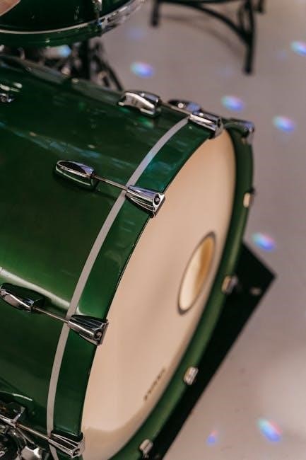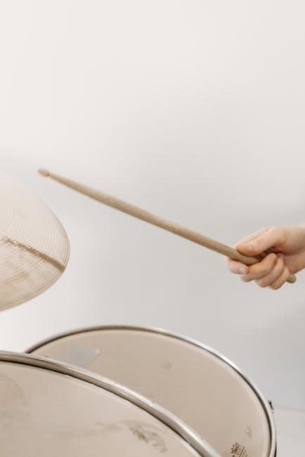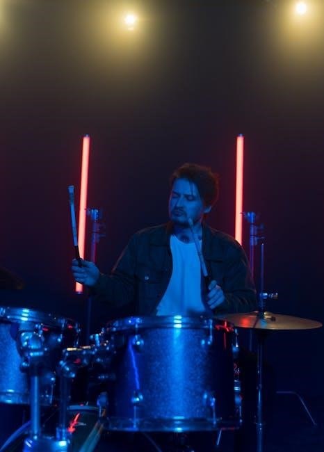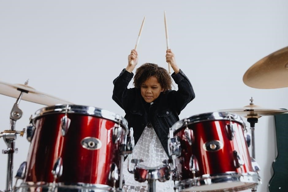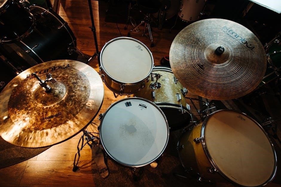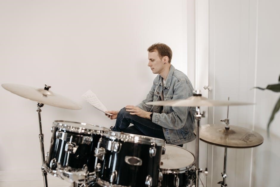 Beginner drum beat PDFs unlock foundational rhythms, offering accessible practice through simple rock, pop, and funk grooves for aspiring drummers.